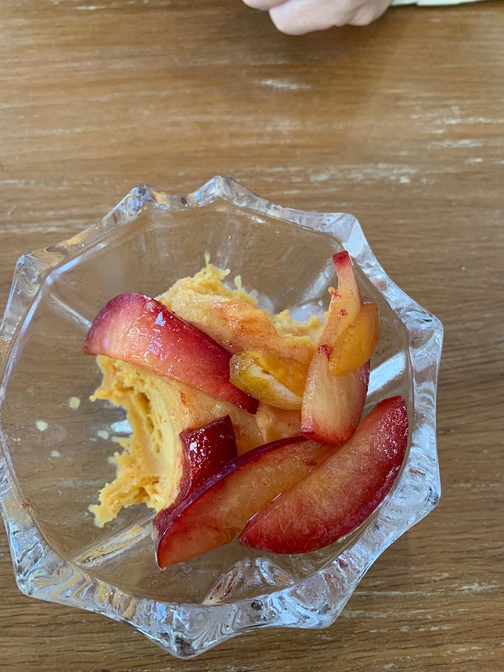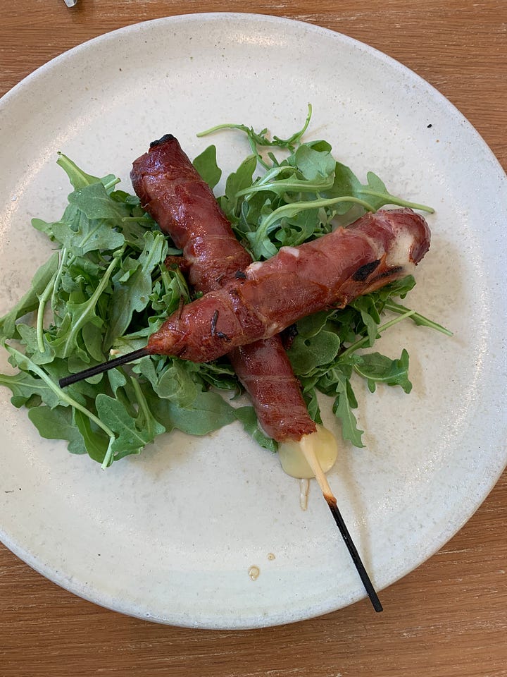 Top left: Spiedini, made with Italian Rontina cheese and wrapped in fantastic prosciutto. Top right: Margherita pizza with fresh mozzarella. Lower left: House special pizza with honey, chilies, and Soprasseta salami. Lower right: Peach Sorbeto (no dairy). All amazing. No wonder I’m feeling a little foggy. 😂